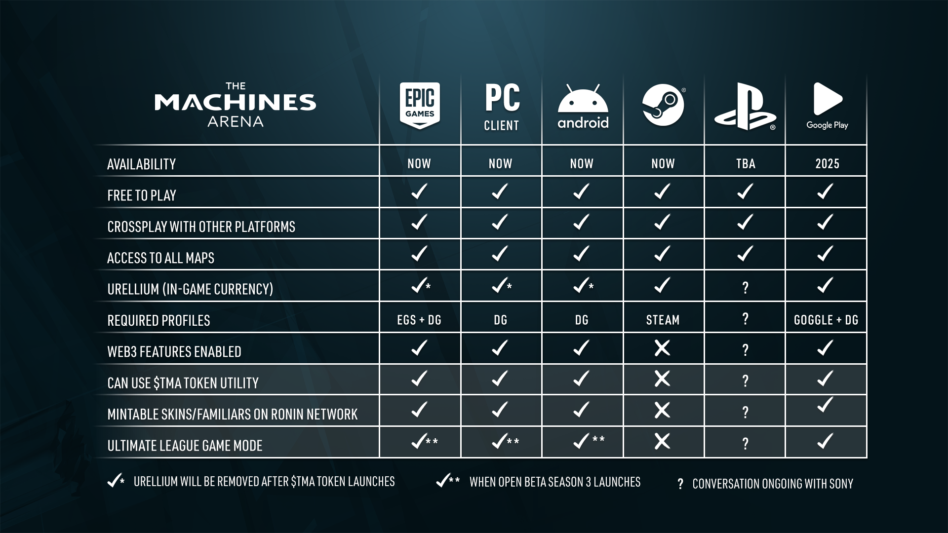 - Platforms such as EGS, PC Client, and Android APK currently support Urellium (the in-game currency), but this will phase out after the introduction of the $TMA token.