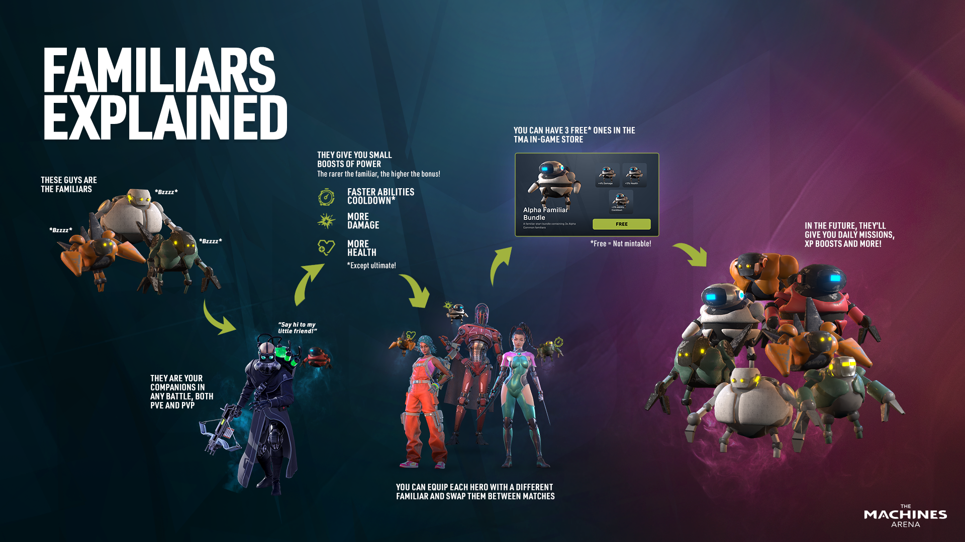 Familiars are unique companions for the heroes of TMA, constructed from lightweight, durable alloys and infused with metatech for supreme versatility. Originating as failed experiments and early prototypes, these Familiars were initially intended as augmentative support units for the Dominators. Despite their seemingly amusing appearance as little floating metal entities, they are far from mere comedic relief; they are integral to the game's strategy, offering tangible yet balanced benefits in both PvE and PvP game modes.
