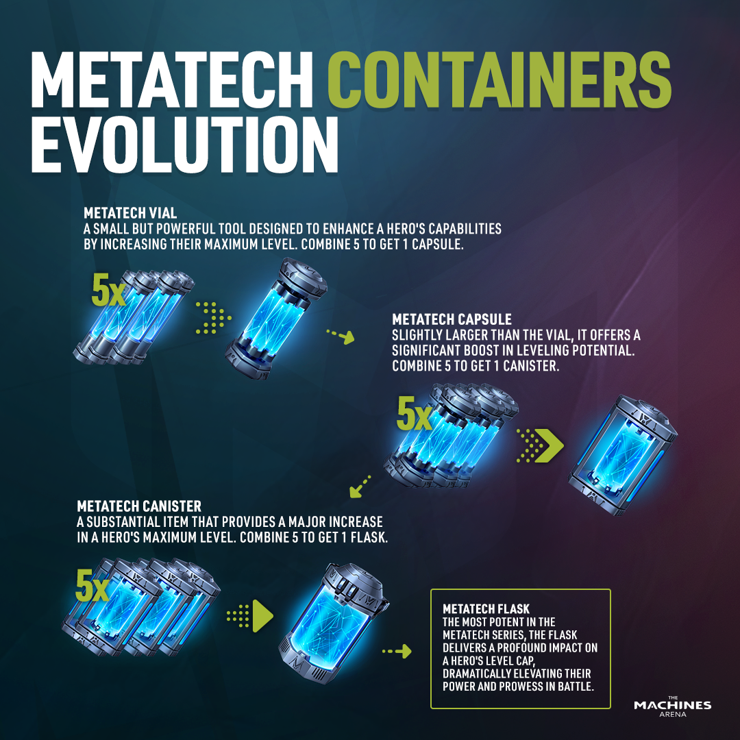 Slightly larger than the vial, the Metatech Capsule offers a significant boost in leveling potential, allowing heroes to push their limits and reach new heights of power. Combine 5 Capsules to get 1 Canister, offering a more powerful enhancement.