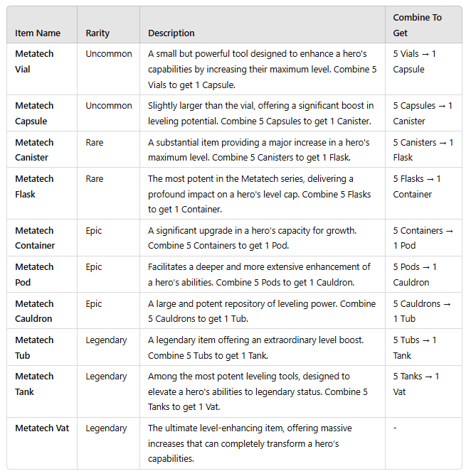 The Metatech series offers a powerful range of items designed to boost a hero's maximum level and enhance their abilities. From the Metatech Vial to the ultimate Metatech Vat, these items provide a clear progression, helping heroes reach new heights of power. In this article, we'll take a closer look at each Metatech item and how they can elevate your hero's strength and potential.